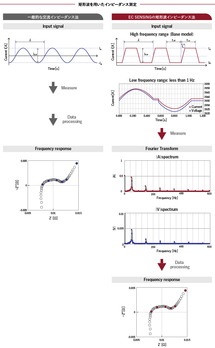 さらに、交流インピーダンス法は、蓄電池に入力する信号の形状によって二つの方式に分けられる。正弦波信号を入力する方式と矩形波信号を入力する方式である。EC SENSINGの矩形波インピーダンス法は後者に含まれる。 この二つの方式を比較すると、矩形波信号を使う方式の方が測定時間を約1/10に短縮できるというメリットがある。正弦波信号を使う方式は、比較的広い周波数範囲の正弦波信号を、周波数を少しずつ変えながら(周波数を掃引しながら)蓄電池に入力する必要があるからだ。一方、矩形波信号には、広い周波数帯域の正弦波信号が含まれているため、一つの矩形波信号を入力するだけで測定が終了する。もちろん測定後に、フーリエ変換を実行して周波数特性を解析しなければならないが、一般的なパソコンでも短時間で実行できる。また矩形波信号は形状が単純なためBMSに内蔵されている電源制御回路(パワー・コントローラ)を有効活用して作り出せる。正弦波信号とは異なり、高価な周波数応答アナライザ(FRA:Frequency Response Analyzer)を付帯する必要がないことも大きなメリットである。